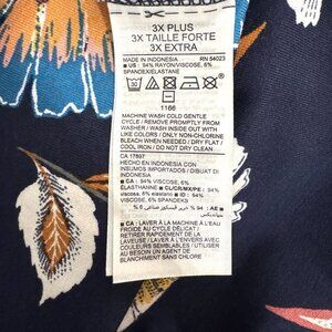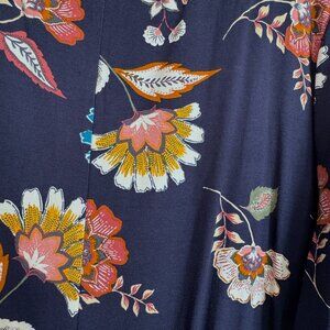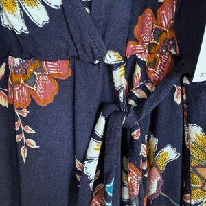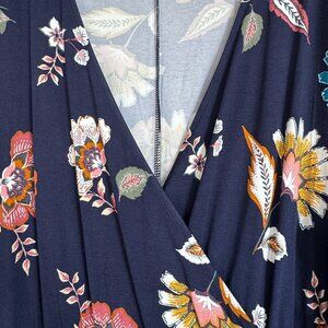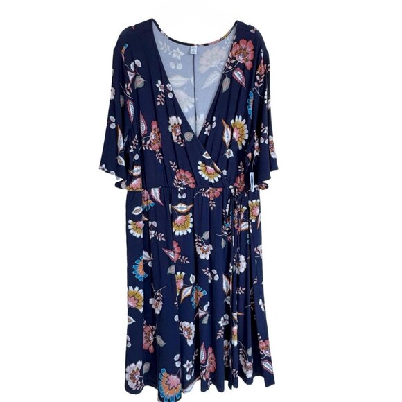 NWT (New with Tags) Old Navy Floral Faux Wrap Dress. Size: 3X. Color: NAVY blue floral with muted yellow, orange and red print. Deep v-neck that is sewn shut so it won't come loose. Floaty bell sleeves that come down to your elbows. Elastic and self tie at waist that lets you adjust the fit. Faux (sewn shut) wrap skirt that is twirly and flattering. Material is heavy-weight jersey but still cool and comfortable.