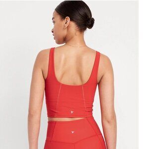 This is the Old Navy Active Light Support PowerSoft Longline Sports Bra/cropped tank in the color Cherry Tomato. Has padded cups.