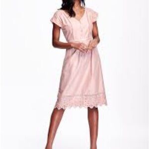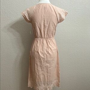 This elegant peach dress features delicate lace trim and a flattering silhouette. Perfect for any occasion, it offers both style and comfort.