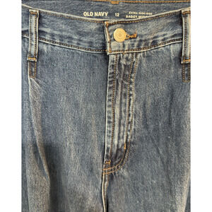 The is a pair of Old Navy Women's Extra High-Waisted Sky-Hi Wide-Leg Jeans in size 12 and blue color. These jeans feature a high rise waist, wide leg style, and are made of 100% cotton denim fabric. They have a zip closure, pleated accents, and a waist size of 34 inches. The jeans also have slash pockets, a 30-inch inseam, 13" front rise and are machine washable. With a comfortable easy fit, these jeans are perfect for all seasons and are easy to care for.