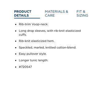 - Style: Rib-Trim Voop-Neck Tunic Sweater, Oversized Slouchy Fit, Rib-Knit Elasticized Hem, Speckled, Marled, Knitted Cotton-Blend, Easy Pullover, Longer Tunic Length