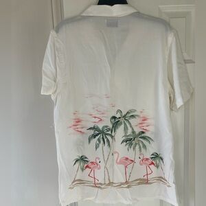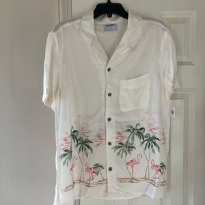 NWT Old Navy Short Sleeve Button Up Camp Pink Flamingo Palm Tree Beach Shirt Med