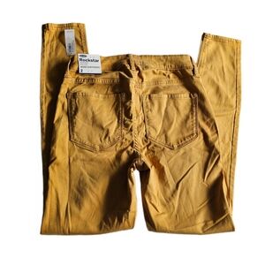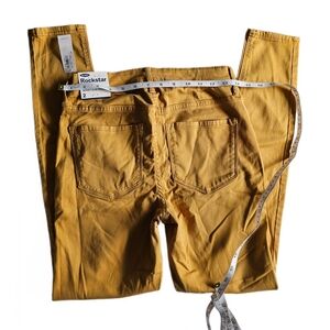 Stylish, Rockstar skinny, high-rise jeans in a vibrant mustard shade.