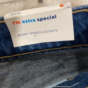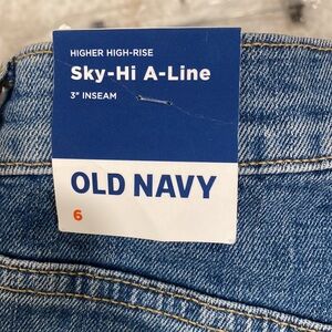 Shorts have a button fly and a 3” inseam. Higher high rise. Sky-Hi A-Line. Distressed.