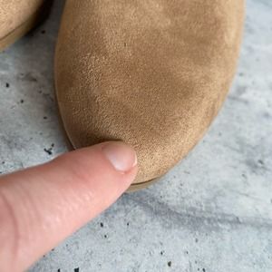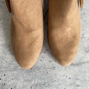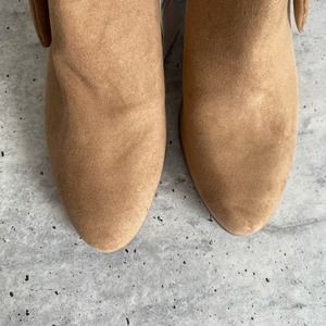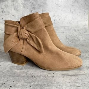 NWT Old Navy light tan beige tie bow ankle bootie. Faux suede style fabric upper, side zip closure, cute bow detail. There is a light divot in the toe of one boot, but it is not very noticeable. Marked a 9, heel is about 2 1/4in.