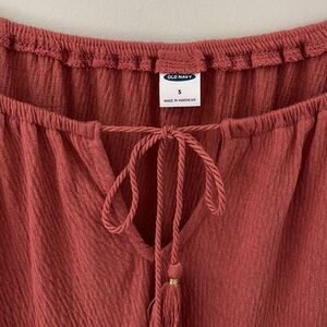 Super cute top with tassel string Turin front. Bell sleeves with crocheted trim.