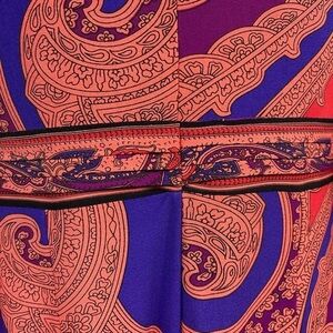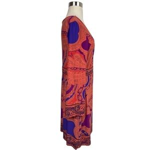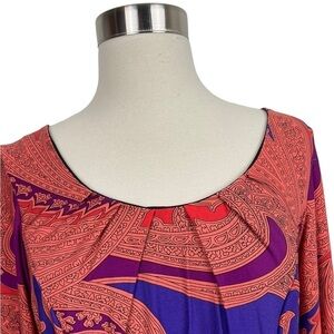 NWT Oleg Cassini L/S Multicolored Paisley Print Scoop Neck Midi Dress. Size 12. Pleated scoop neckline and bell sleeves. Peach, orange, purple, blue and black.