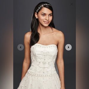 This dress was never wore in a wedding; only tried on by customers at David’s Bridal. Since others were able to try it on, there are a few spots on the underside of the dress at the bottom train. Last pic shows views from both the top and under the dress where the spots are located. I’ve owned this dress for years and didn’t notice the spots until it was recently tried on. This dress was never wore in a wedding; only tried on by customers at David’s Bridal. Smoke-free home.