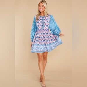 New with tags! Perfect condition. Oliphant Tie Front Balloon Sleeve Dress in Iris Blue Print. Size women's small. Originally $215.