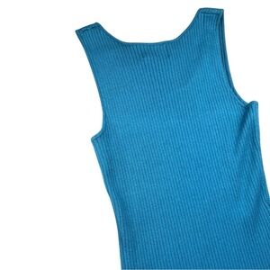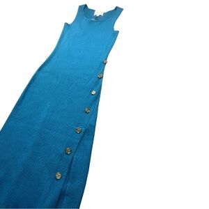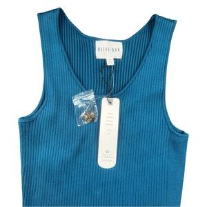 The NWT Olive and Oak Jersey Knit Tank Dress in color Nightfall, size M, is a stylish and comfortable casual dress perfect for everyday wear. Made from a blend of polyester and rayon, this sleeveless dress features a solid turquoise color and a round neckline with a button accent. The pullover style and stretch fabric make it easy to wear and care for, while the midi length adds a versatile touch to the overall look. Ideal for women looking for a fashionable and relaxed outfit option.