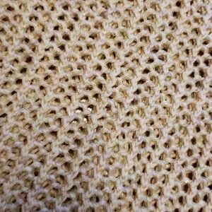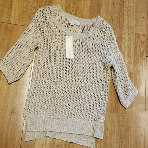 Neutral I vory sweater with gold metallic thread. 3/4 sleeves. Loose weave scoop neck tunic length. New with tags. Acrylic, cotton, polyester blend with metallic. Approximately 18.5 in pit to pit. 27.5 in shoulder to hem.