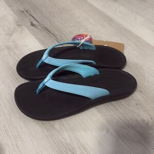 OluKai Kulapa Kai flip-flop. Color COTTON CANDY(light blue)/BLACK in Women’s size US 6. Best Seller! Great sandal for everyday use or when you’re headed to the beach/pool/lake.