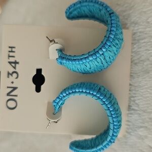 NWT On 34th Silver Tone Medium Color Seed Beed & Raffia C-Hoop Teal Earrings