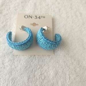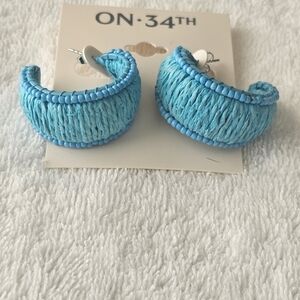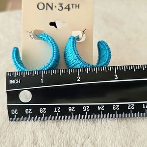 NWT On 34th Silver Tone Medium Color Seed Beed & Raffia C-Hoop Teal Earrings