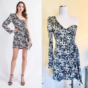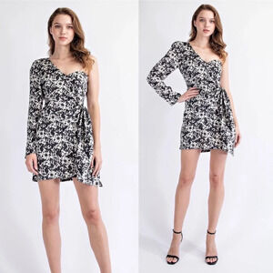 NWT Edit by Nine One Shoulder, Faux Wrap, Side Tie, LBD Mini Cocktail Dress. Black & White