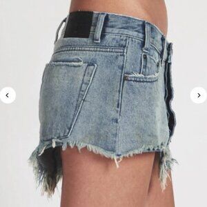 NWT One Teaspoon Cowboy Junkyard Distressed Frayed Hem Mini Jean Skirt. Brand Color: Cowboy - a mid-dark wash with fading, distressing, and light ripping (on front) Size 25