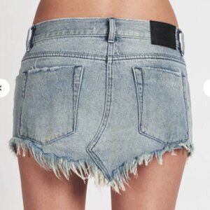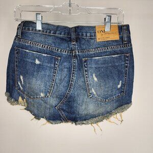 NWT One Teaspoon Cowboy Junkyard Distressed Frayed Hem Mini Jean Skirt. Brand Color: Cowboy - a mid-dark wash with fading, distressing, and light ripping (on front) Size 25