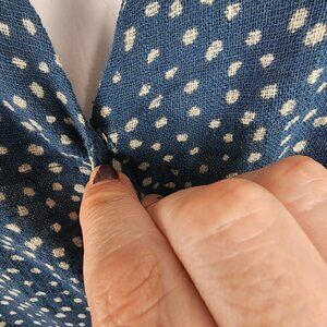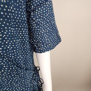 A navy hue dress with white print on it. The print are not star shapes but instead perfectly imperfect shaped "dots" of sorts