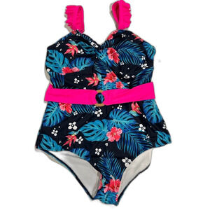 This belted swimsuit with ruffled shoulder straps and belt would be perfect for a tropical vacation, the beach or a cruise. The bus is wireless with removable cups and the shoulder straps are adjustable