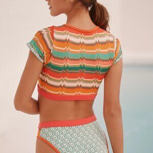 Bright and bold design from Anthropologie. Eye-catching pink and orange hues. Brand new! Gorgeous cut. High waisted high leg bottoms and a crop tee style top.