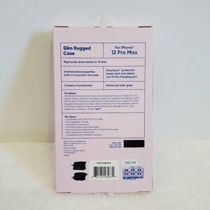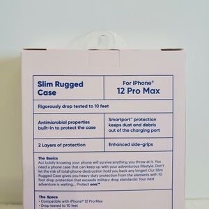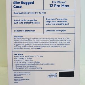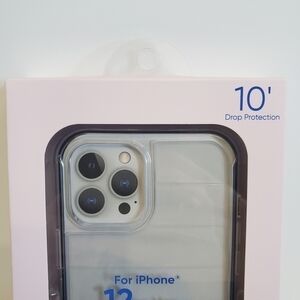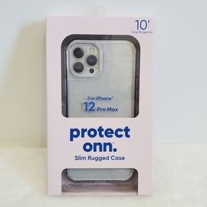 NWT Protect Onn. Slim Rugged Iphone 12 Pro Max Clear Case. Slim & sleek profile, enhanced side grips, dual layer construction, corner bumper protection, rear texture design, antimicrobial properties built in to protect the case, smartport protection, compatible with wireless charging, 2.5X military drop test height, 10' drop protection. Brand new with tags! 2 available.