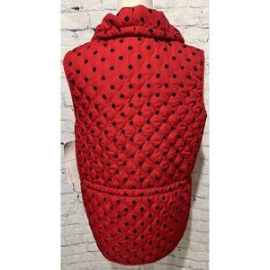 This NWT Onque Casual red and black Polka Dot quilted lightweight Zip Front vest in size L is a stylish and versatile piece of women's clothing. Made from polyester, the vest features a sleeveless design with a zip closure and a quilted accent for added flair. Perfect for casual occasions, this lightweight vest in a bold red color is sure to add a pop to any outfit, making it a great addition to any wardrobe. 20 inches pit to pit and 25 inches long. Smoke free home.
