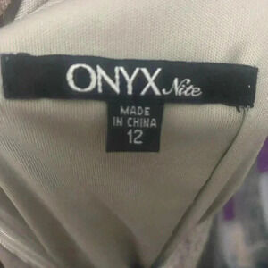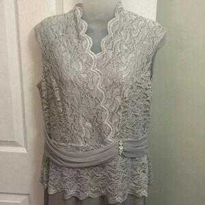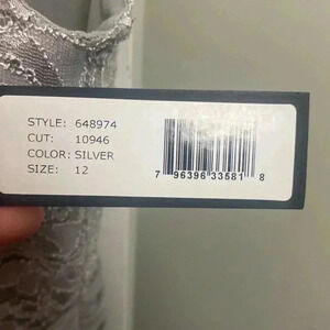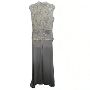 Beautiful formal gown. Classic silver color. Lace detail to top with rhinestone detail. Flowy bottom. Lined. Sleeveless. Perfect for mother of the bride, party, wedding.