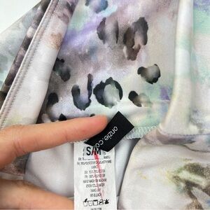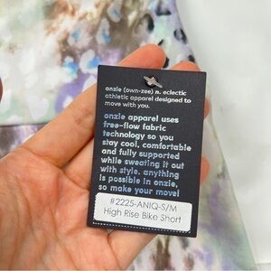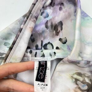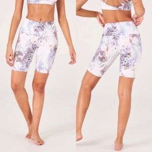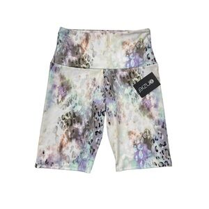 NWT Onzie Animal Quartz Printed High Rise Bike Shorts. White multicolor. Watercolor pastel. Mid length thigh. Stretch. Polyester spandex blend. Brand tag crossed out see photos. Size Small/Medium. Size S/M. Waist: 12" across. Rise: 11". Inseam: 9". (888)