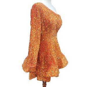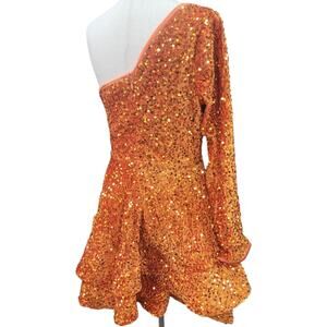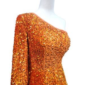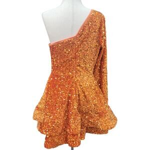 NWT Orange Asymmetric One Long Sleeve Short Sequin Dress