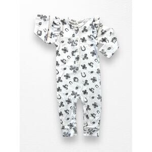 New with tags from Kate Quinn Organics: long sleeved union sport jumpsuit in size 12-18 months. Features a front button placket, ruffles on shoulders, snaps in legs, and is white with an all over “lucky Irish” print in charcoal. Made from 100% organic cotton.