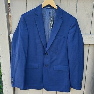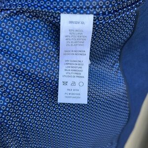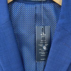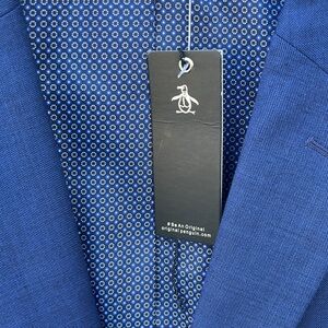 NWT Orginal Penguin Slim Fit Suit Fitted Cut Tapered Leg 38R 32W 32L Wedding Guest Wool Blend Blue 2 Piece Suit. Has one small mark please see photos for item condition description.