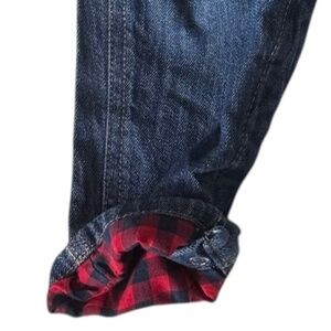 Oshkosh B’gosh Blue Jean Denim bib Overall. Ruffle trim edge front pockets. Can be cuffed up to show red and black buffalo check.