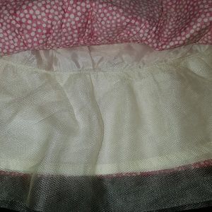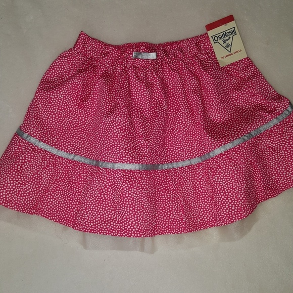 Brand new OshKosh skirt in raspberry pink with white polka dots. It has silver ribbon trim and a layer of tulle peaking out from the bottom. New with tag, size 8.