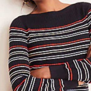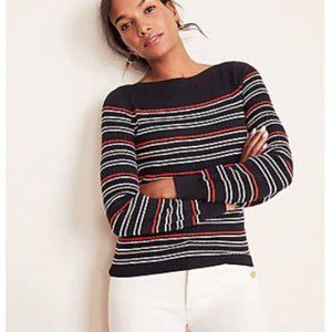 NWT Ann Taylor Ottoman Stripe Boatneck Sweater. This soft and lovely ottoman stripe sweater keeps your wardrobe in line - all season long. Stylish boatneck in stretchy knit, black with red, pink, blue, tan, and white stripes.Medium weight sweater in a super flattering cut and fabric. Comfy and so versatile! Long sleeves. Ribbed neckline, cuffs and hem. 55% viscose, 45% nylon. Machine washable. Brand new with tags.