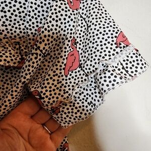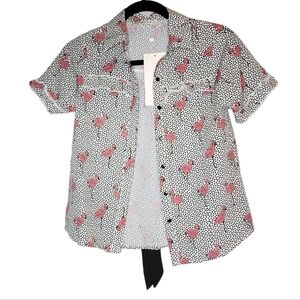 Ouropeanztation white and black polka dots with pink flamingo button front short sleeve shirt.