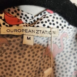 NWT Ouropeanztation Flamingo Button Front Blouse Shirt With Tie Neck XS/S