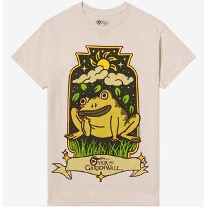 A gentle wind beckons you to take a journey into the Unknown! This Over the Garden Wall tee features a tarot card-inspired design of frog Jason Funderburker posing under clouds, stars and a sun. Plus, a banner with the show's title.