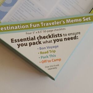 Great gift for a traveler or mom! New in box. Four pads with checklists on everything to pack for international travel, camp, a road trip or your next destination. Great way to keep organized.