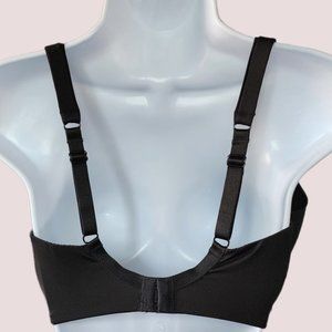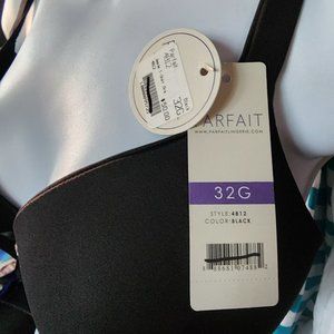 Black T shirt bra by PARFAIT. Smooth, molded cups giving lift and defined shape. Virtually seamless under t-shirts or any other top. Underwire, adjustable straps. Material is 85% nylon and 15% elastane. If you are a 32 G, give this a try for everyday wear. You will love the comfort.