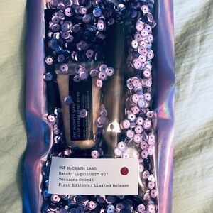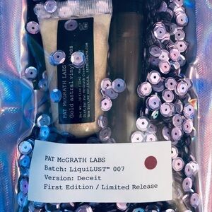 Authentic. Sealed. PAT MCGRATH DECEIT 007 - A LIQUILUST duo of Liquid Lipstick and Astral Vinyl Gloss elevates lip artistry to opulent ombrés and surreal shine. rebelliously revolutionary LiquiLUST™ formulation that leaves lips velvet-smooth while delivering the carnally charismatic colour you crave. Use Gold Astral Vinyl gloss to create a sick lip or alone! Sealed Purple Package includes: Deceit Liquid Lipstick and Gold Astral Vinyl Gloss and many sequins!