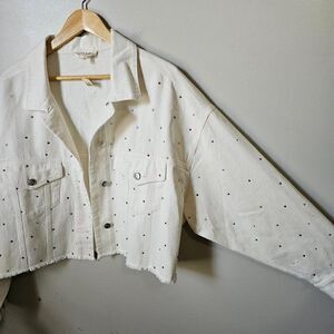 NWT PEACH LOVE WHITE DENIM CROPPED RAW HEM EMBELLISHED JACKET OVERSIZED L