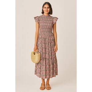 This beautiful Perry Walker dress is perfect for any casual occasion. The floral pattern and ruffle sleeves add a touch of playfulness to the smocked and tiered midi dress. The high neckline and short sleeves make it suitable for all seasons.