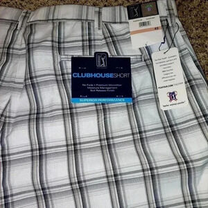 NWT PGA Tour Golf Shorts Mens 42 White Gray Tan Flat Front Plaid Slash Pockets