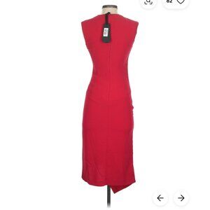 Brand new with tags. Sleeveless red cocktail dress with a boat neckline, wrap silhouette, and ruched detailing. Midi-calf length. 98% polyester, 2% elastane.