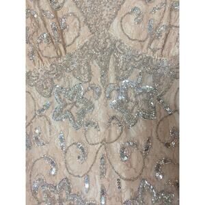 NWT PISARRO NIGHTS DRESS 2 GOWN SEQUIN BEADED FLORAL STAR LONG MAXI LONG SHEER 3/4 SLEEVES EVENING GLAM NUDE BEIGE LACE SILVER SEQUINS FLAPPER WEDDING GUEST