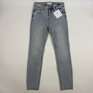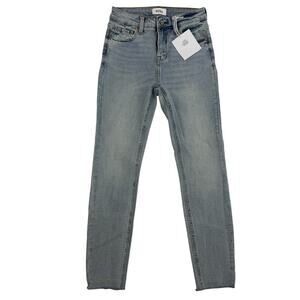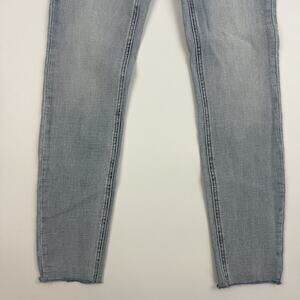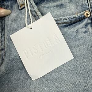 This is a pair of NWT PISTOLA Arielle Skinny Scissor Cut Hem Jeans in size 26P with a No Pressure Wash design. The jeans feature a solid denim fabric wash in a light blue color, a mid-rise waist, and a skinny style. They have a 5-pocket design with a zip and button closure. Made of a blend of polyester, rayon, cotton, and elastane, these jeans are machine washable and have a 25.5-inch inseam. The design theme includes elements of USA, Boho, Lunch Date, Logo, and Preppy, making them versatile for various occasions.