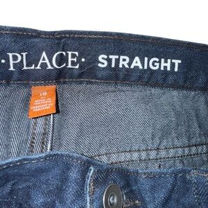 The image shows a pair of "The Children's Place" girls' size 16 blue straight-leg jeans. The jeans are a dark wash and have a classic five-pocket design. These jeans are new with tags (NWT). The straight-leg cut offers a timeless silhouette, making them a versatile addition to a young person's wardrobe.