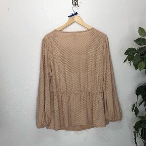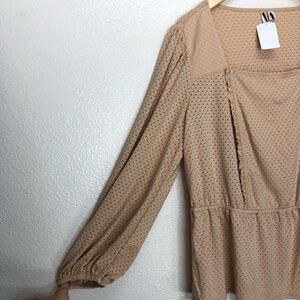 A apron-looking front on the blouse. Puffy sleeves with elastic around the wrists. Elastic around the waist with a little flow. Lined on front and shoulders, the rest of the shirt is see through through the holes.