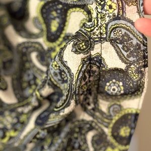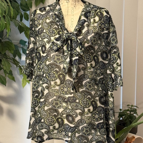 Short sleeved, capped/ elastic. Gray with black paisley. Sheer, Polyester, loose fitting.