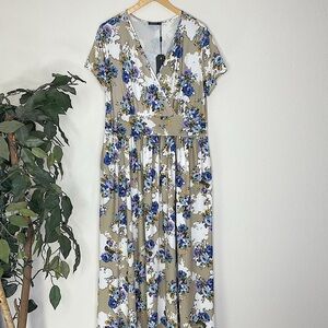 A silky maxi dress with a beautiful floral pattern. Faux wrap top with a wide detail around the waist. Short sleeve. Light weight